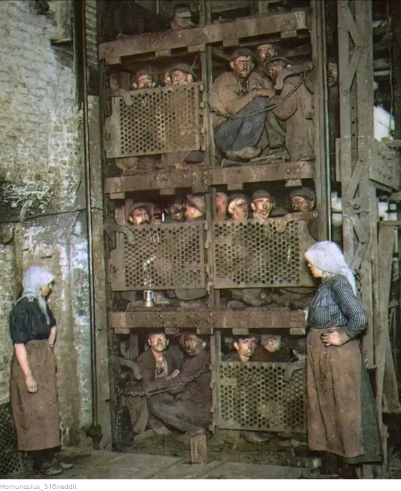Mint a képen is látható, a felvonók többszintesek voltak, de minden szint olyan alacsony volt, hogy a bányászoknak ülő helyzetben kellett használniuk.