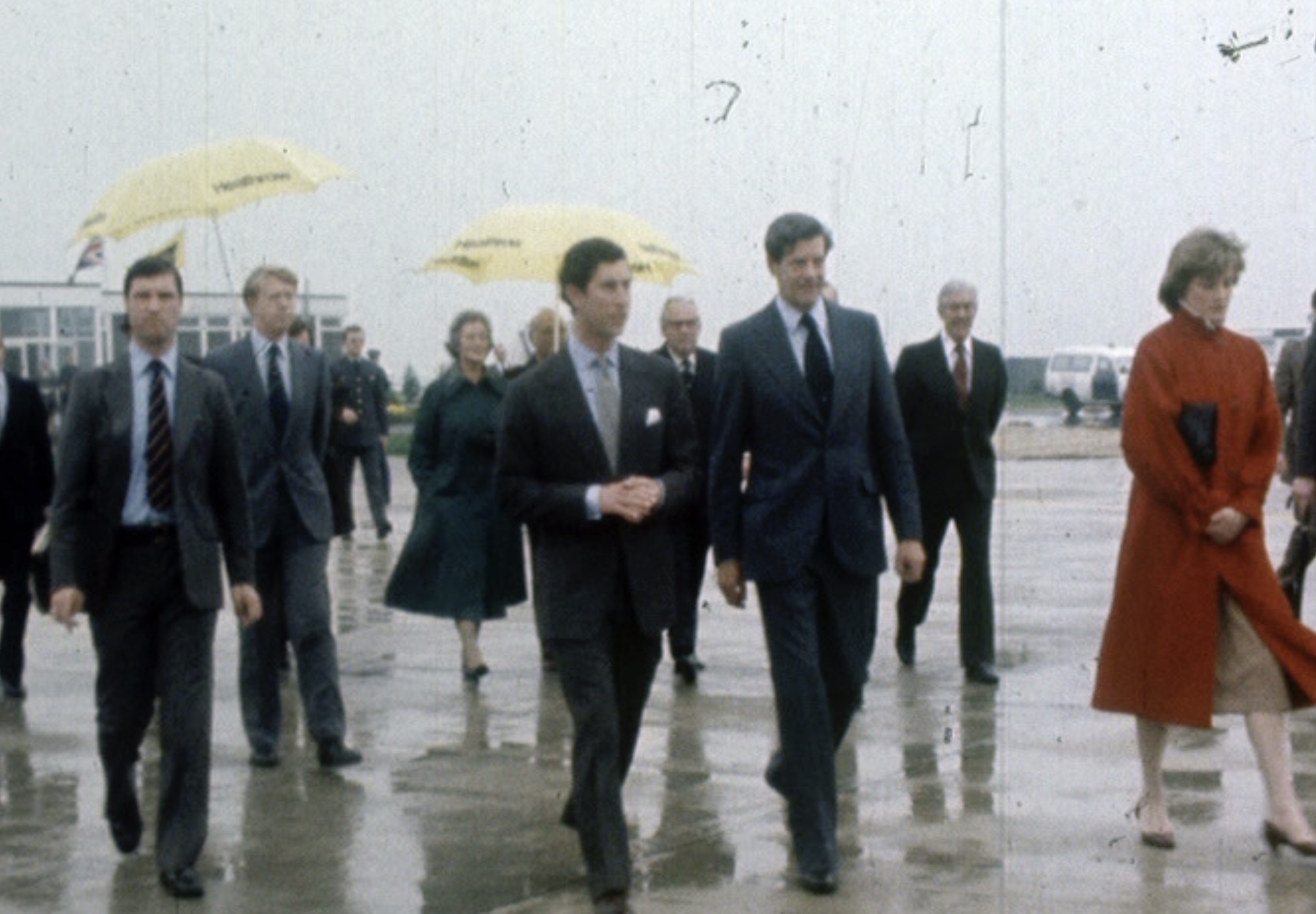 Diana piros kabátba, barna szoknyába és barna bőrcipőbe öltözve sétált a herceg mellett a reptéri pocsolyákon keresztül, miután megérkezett a királynő Rolls-Royce-ával.