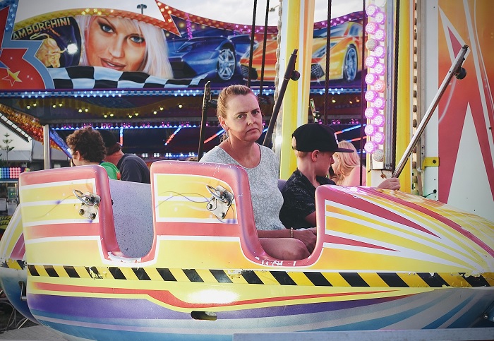 2. A feleségemmel kő-papír-ollóval döntöttük el, hogy ki üljön fel a kisfiunkkal az egyik meredek vidámparki játékra, és én nyertem, így a feleségemnek kellett bevállalnia. Azt hiszem, hogy minden az arcára van írva.